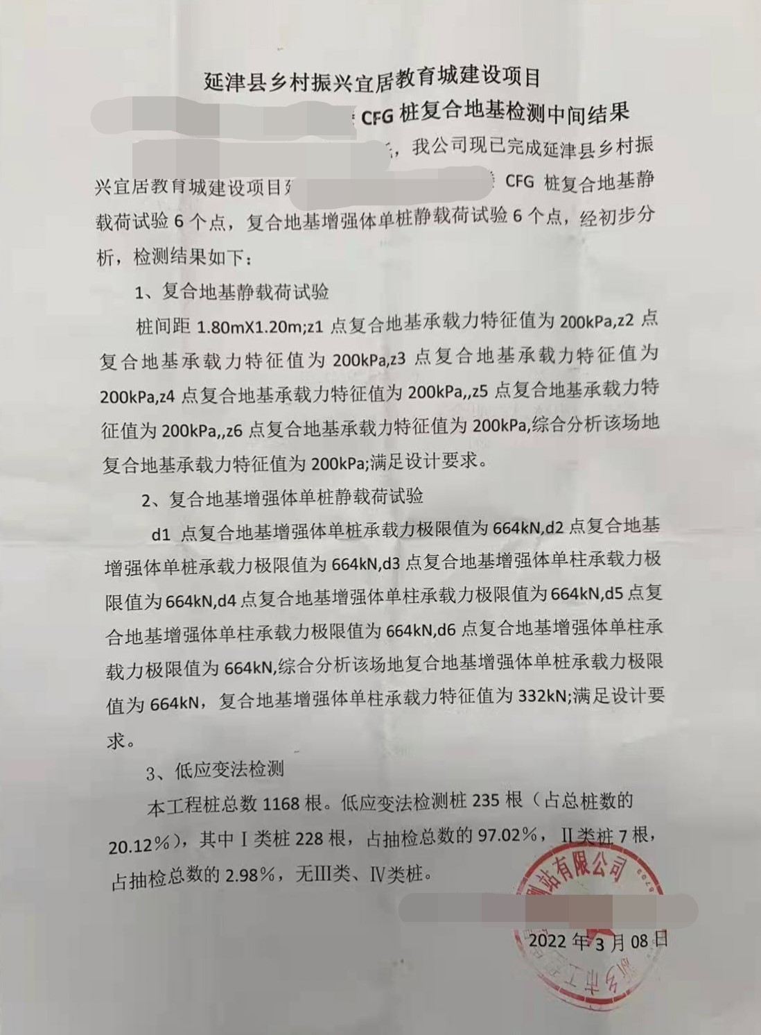 3月份延津鄉村振興教育城項目傳來喜訊,CFG樁復合地基檢測完成,檢測結果全部滿足設計要求,其中I類樁占抽檢總數的97.02%II類樁占比2.98%,無III類樁、IV類樁,應用效果顯著。