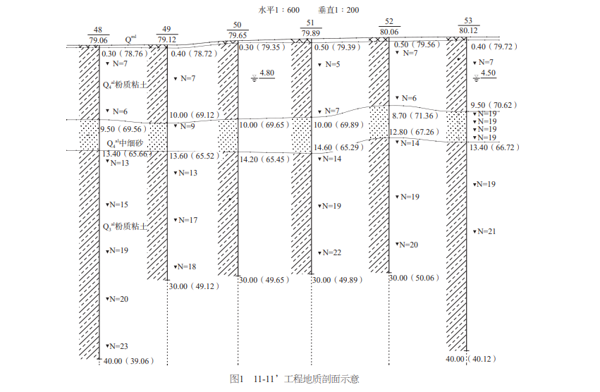 根據勘察報告,該區域以粉質粘土為主,地下水位約為自然地面下5m,自然地面以下約10~14m存在4m厚中細砂層且分布不均勻(圖1),此為典型液化地層;根據該地質情況設計采用鋼筋混凝土樁。